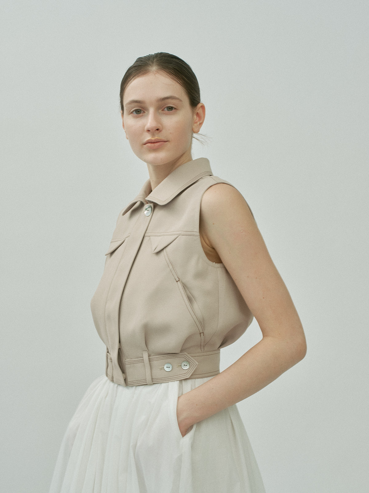 短丈ながら構築的に、甘さを削ぎ落とした凛とした一着です。
