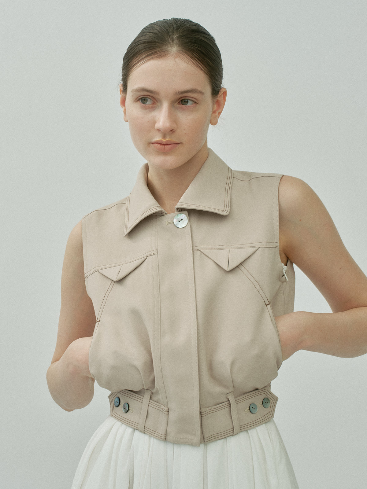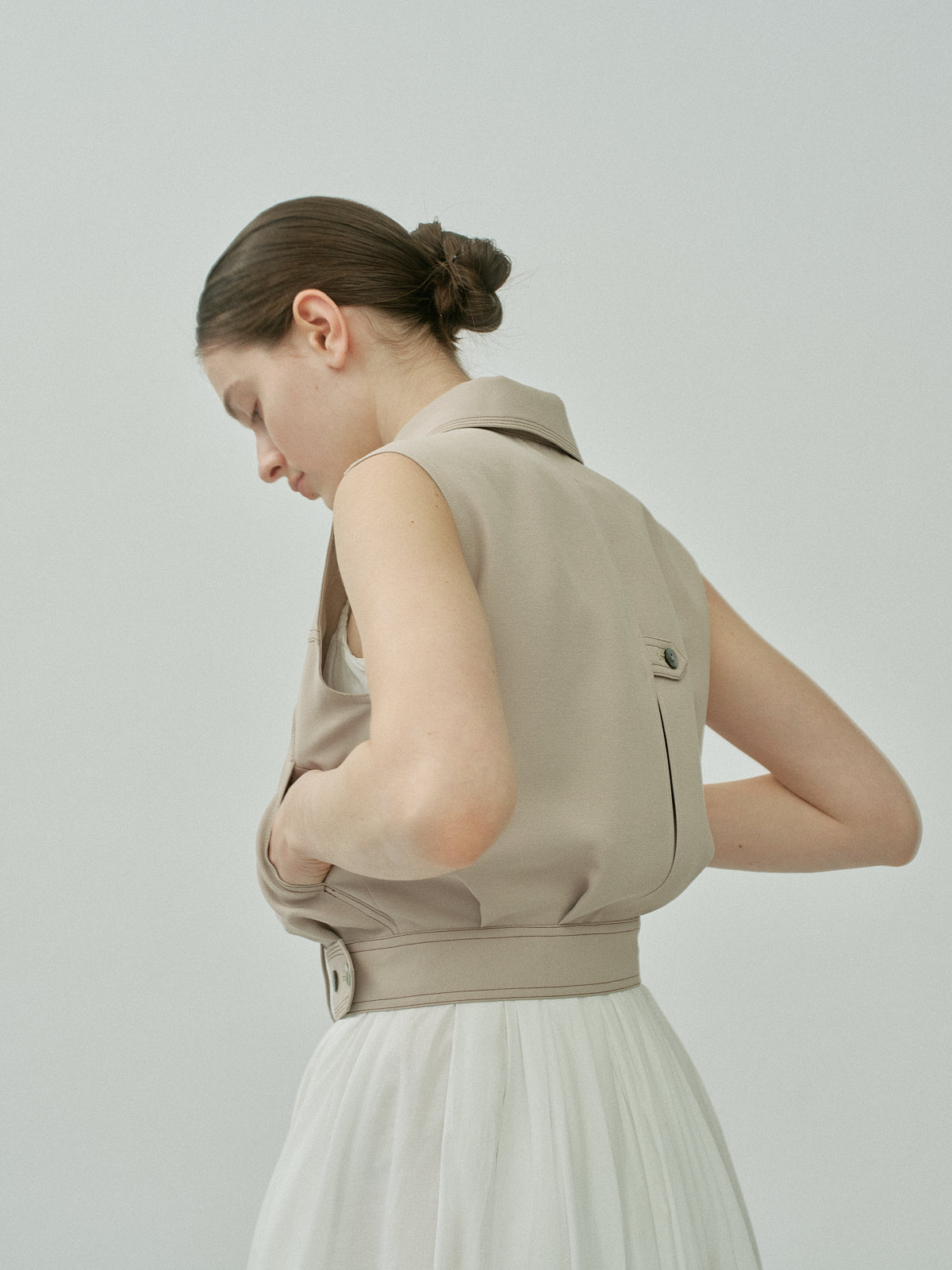。すっきりとした印象を保ちながら着脱のしやすさも両立しました。裾にはさりげないカッティングディテールを施し、シャープさと柔らかさを同居させました。